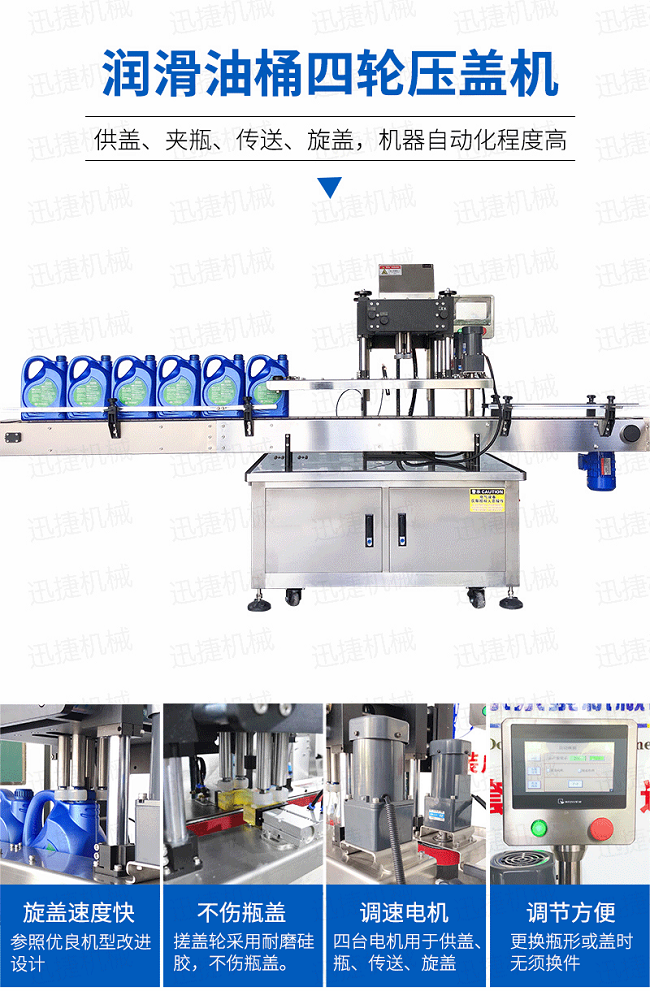自動旋蓋機原理:電氣控制運動,穩定性強;設有定位裝置,旋蓋標準,操作方便;鎖蓋范圍寬,可鎖不同形狀規格的瓶蓋;解決了噴頭、泵頭、噴霧泵、手扣式噴頭旋蓋難的問題;鎖蓋轉速可調,可根據不同瓶蓋調節松緊度。
