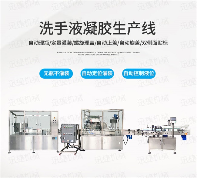 全自動凝膠生產線適用于消毒凝膠、免洗手洗手液、免洗手消毒凝膠、消毒液、84消毒液、醫用酒精、75%酒精消毒液、75度酒精、消毒水、殺菌消毒劑、醫用酒精、碘酒、次氯酸鈉、劑、醫用乙醇消毒液、瓶裝消毒劑等產品,有多頭全自動消毒液灌裝機和封箱機、貼標機、打包機、噴碼機等配套設備組成,實現消毒液自動灌裝,自動旋蓋,自動貼標,從灌裝、到成品的全部過程